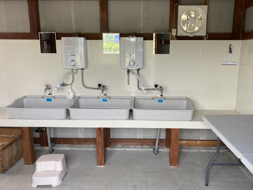 洗面所は3か所(鏡あり)、湯沸し器が2台あります。小さなお子様用に踏み台もご用意しております。