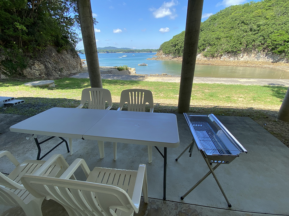 バーベキュースペースにテーブル・チェア・ライト・バーベキューコンロ・木炭・紙皿等をご用意しております。